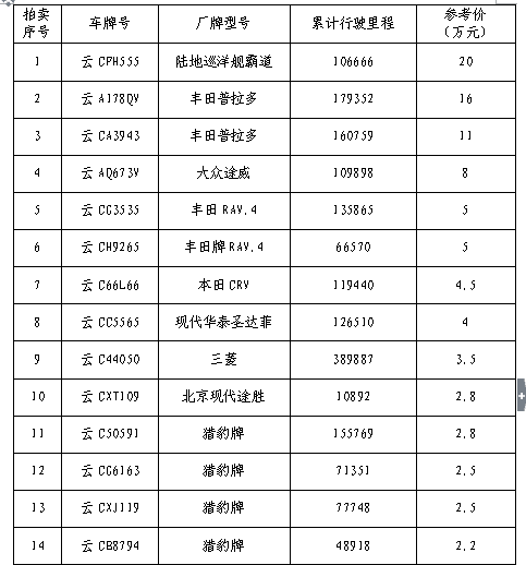 經(jīng)鎮(zhèn)雄縣人民政府批準,受鎮(zhèn)雄縣國有資產(chǎn)管理局委托,公開拍賣鎮(zhèn)雄縣公車20輛。以輛為單位拍賣。相關事項如下: